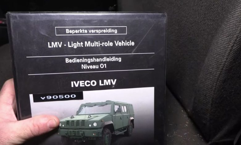 Onder de pantservoertuigen bevindt zich een in het oog springende trofee: een Iveco LMV ter waarde van 405.000 euro mét Nederlandse handleiding. ‘Beperkte verspreiding’, ‘Bedieningshandleiding Niveau 01’, staat op de omslag.