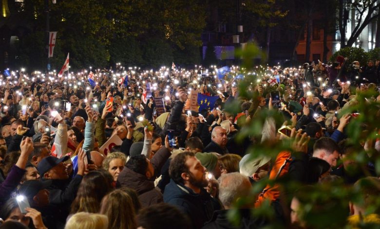 De afgelopen nachten kwam het tot confrontaties met de politie, die traangas, een waterkanon en rubberkogels inzette. Demonstranten droegen Europese en Georgische vlaggen met zich mee.
